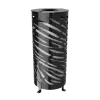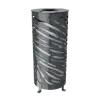 Το συνολικό ύψος του κάδου είναι περίπου 0.90 m και η διάμετρος του 0,40 m. To κυρίως σώμα του κάδου κατασκευάζεται από προγαλβανισμένο χάλυβα πάχους 3mm, ο οποίος επεξεργάζεται με την χρήση τεχνολογίας Laser έτσι ώστε να αποτυπωθεί το μοναδικό σχέδιο που φέρει. Το καπάκι του κάδου ανοίγει περιστροφικά με μεντεσέ οριζοντιας κίνησης και είναι κατασκευασμένο από ελάσματα πάχους 4 mm. Διαθέτει κλειδαριά κατάλληλη για εξωτερικό χώρο. Η στερέωση στο έδαφος πραγματοποιείται με στριφώνια καθώς ο κάδος έχει κατάλληλη διαμόρφωση με οπές στα πέλματα του. Το προϊόν θα παραδοθεί βαμμένο ηλεκτροστατικά με πολυεστερική πούδρα στην απόχρωση που θα έχει επιλέξει ο πελάτης.