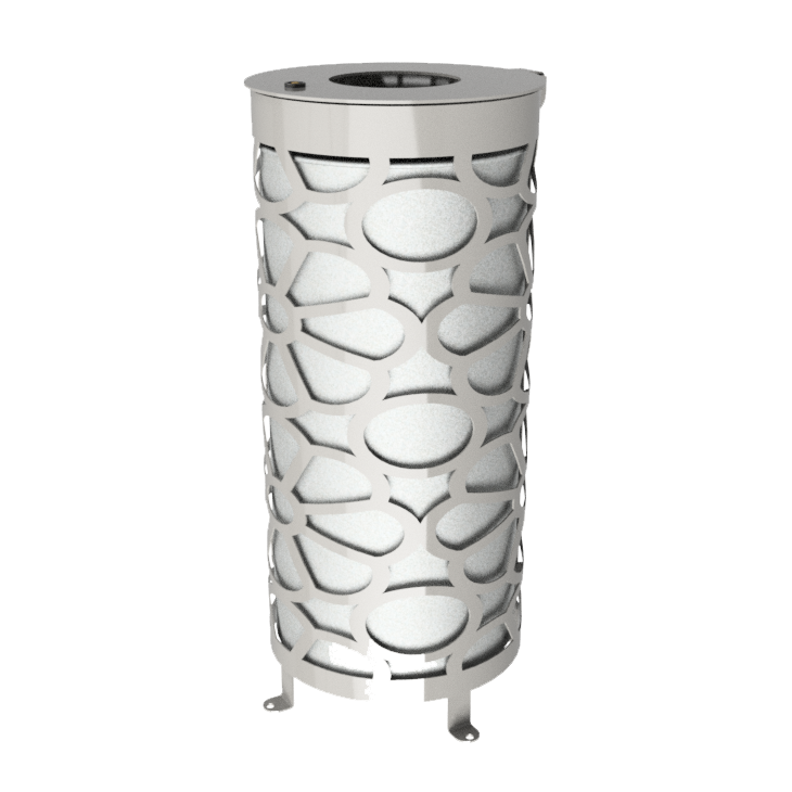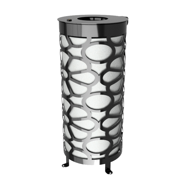 Το συνολικό ύψος του κάδου είναι περίπου 0.90 m και η διάμετρος του 0,40 m. To κυρίως σώμα του κάδου κατασκευάζεται από προγαλβανισμένο χάλυβα πάχους 4mm, ο οποίος επεξεργάζεται με την χρήση τεχνολογίας Laser έτσι ώστε να αποτυπωθεί το μοναδικό σχέδιο που φέρει. Το καπάκι του κάδου ανοίγει περιστροφικά με μεντεσέ οριζοντιας κίνησης και είναι κατασκευασμένο από ελάσματα πάχους 4 mm. Διαθέτει κλειδαριά κατάλληλη για εξωτερικό χώρο. Η στερέωση στο έδαφος πραγματοποιείται με στριφώνια καθώς ο κάδος έχει κατάλληλη διαμόρφωση με οπές στα πέλματα του. Το προϊόν θα παραδοθεί βαμμένο ηλεκτροστατικά με πολυεστερική πούδρα στην απόχρωση που θα έχει επιλέξει ο πελάτης.
