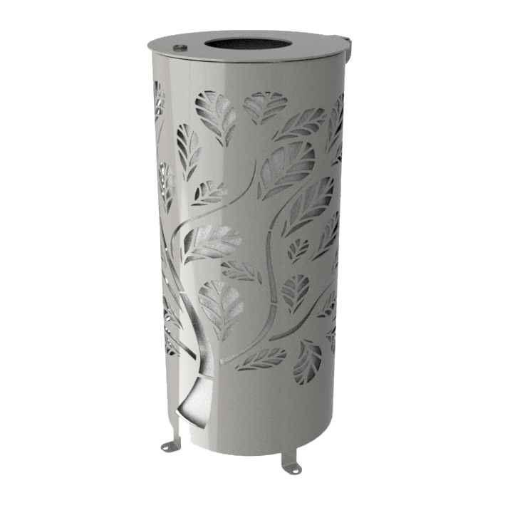 Το συνολικό ύψος του κάδου είναι περίπου 0.90 m και η διάμετρος του 0,40 m. To κυρίως σώμα του κάδου κατασκευάζεται από προγαλβανισμένο χάλυβα πάχους 2mm, ο οποίος επεξεργάζεται με την χρήση τεχνολογίας Laser έτσι ώστε να αποτυπωθεί το μοναδικό σχέδιο που φέρει. Το καπάκι του κάδου ανοίγει περιστροφικά με μεντεσέ οριζοντιας κίνησης και είναι κατασκευασμένο από ελάσματα πάχους 4 mm. Διαθέτει κλειδαριά κατάλληλη για εξωτερικό χώρο. Η στερέωση στο έδαφος πραγματοποιείται με στριφώνια καθώς ο κάδος έχει κατάλληλη διαμόρφωση με οπές στα πέλματα του. Το προϊόν θα παραδοθεί βαμμένο ηλεκτροστατικά με πολυεστερική πούδρα στην απόχρωση που θα έχει επιλέξει ο πελάτης.