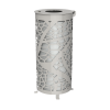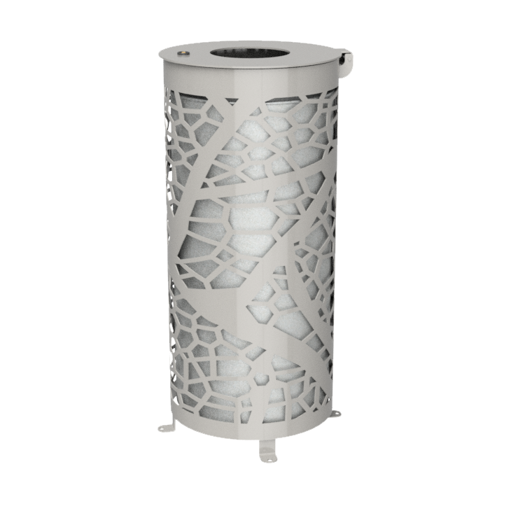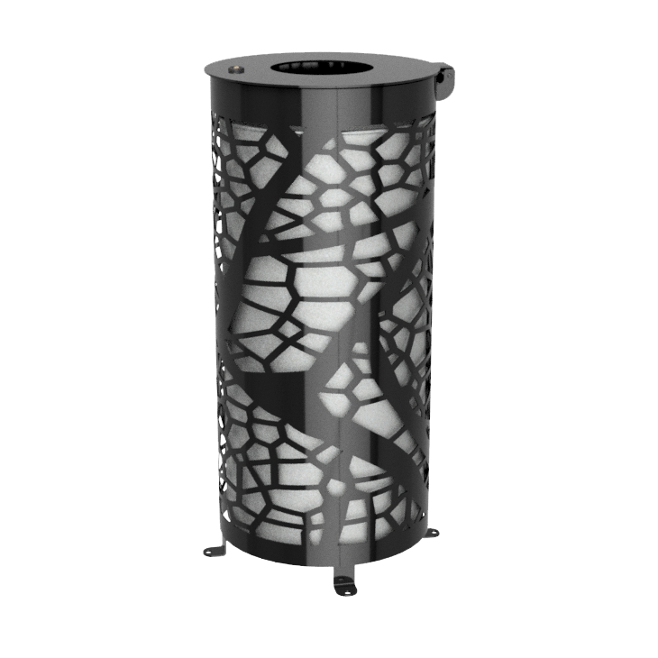 Το συνολικό ύψος του κάδου είναι περίπου 0.90 m και η διάμετρος του 0,40 m. To κυρίως σώμα του κάδου κατασκευάζεται από προγαλβανισμένο χάλυβα πάχους 3mm, ο οποίος επεξεργάζεται με την χρήση τεχνολογίας Laser έτσι ώστε να αποτυπωθεί το μοναδικό σχέδιο που φέρει. Το καπάκι του κάδου ανοίγει περιστροφικά με μεντεσέ οριζοντιας κίνησης και είναι κατασκευασμένο από ελάσματα πάχους 4 mm. Διαθέτει κλειδαριά κατάλληλη για εξωτερικό χώρο. Η στερέωση στο έδαφος πραγματοποιείται με στριφώνια καθώς ο κάδος έχει κατάλληλη διαμόρφωση με οπές στα πέλματα του. Το προϊόν θα παραδοθεί βαμμένο ηλεκτροστατικά με πολυεστερική πούδρα στην απόχρωση που θα έχει επιλέξει ο πελάτης.