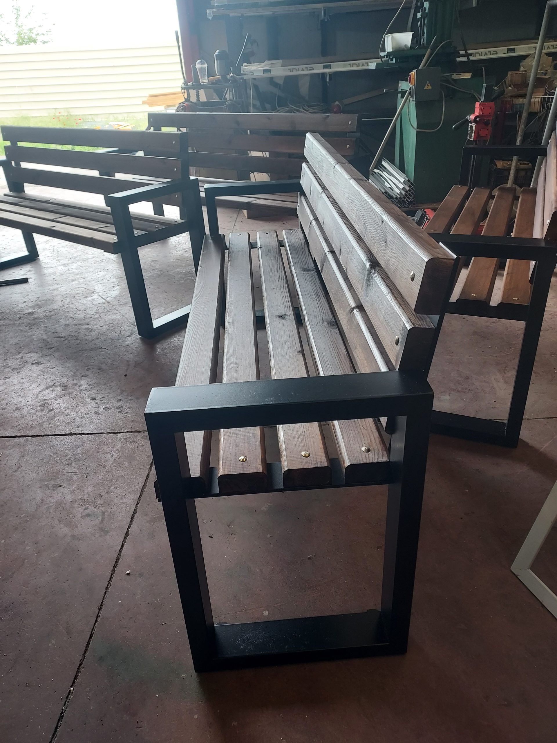 Η μεταλλική βάση του καθιστικού είναι κατασκευασμένη από κοιλοδοκό παραλληλόγραμμης διατομής διαστάσεων 80x40x3mm ενώ οι ξύλινες δοκοί στηρίζονται σε λάμες διατομής 80Χ8mm οι οποίες είναι συγκολλημένες στις πλευρικές βάσεις.